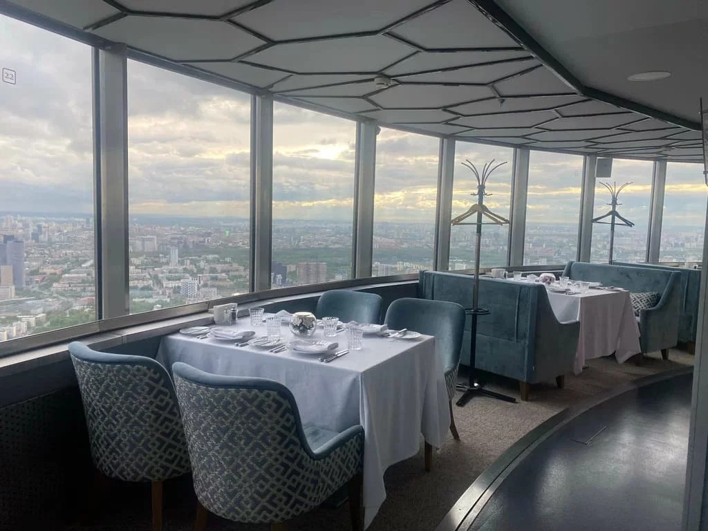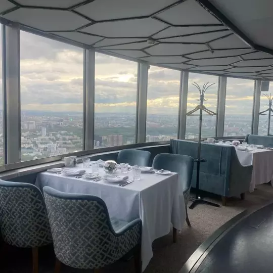 В завершении панорамной экскурсии школьники попадают в ресторан «Седьмое небо», он располагается на различных уровнях: ресторан -328 метров, кафе – 331 метр, бистро – 334 метра. Здесь можно вкусно покушать и полюбоваться видами Москвы. Ресторанный корпус можно посещать не только как турист, тут можно провести праздник или романтический ужин по приятной цене.